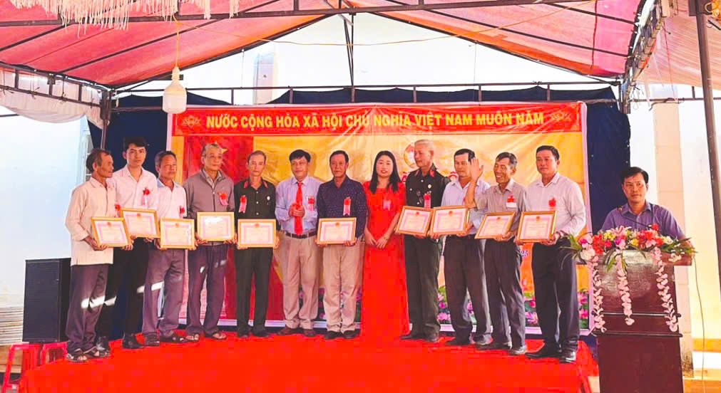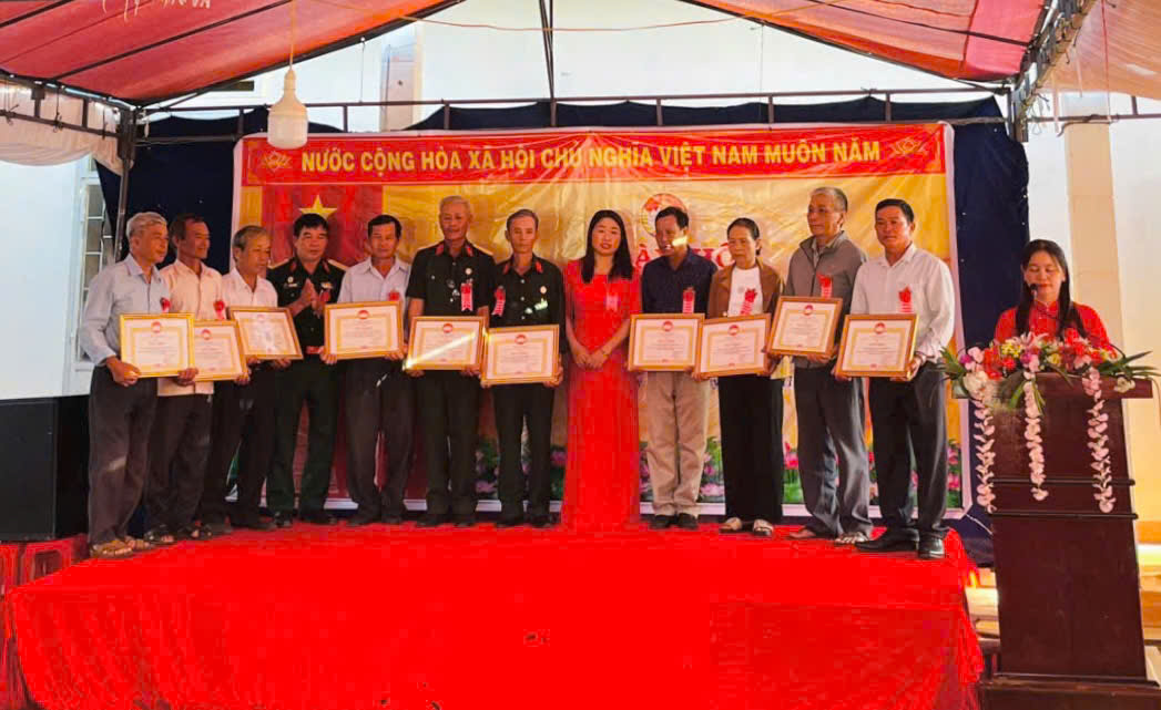Nhân dịp này, đồng chí Phạm Ngọc Kha thay mặt Thường trực Mặt trận tỉnh tặng 02 ngôi nhà Đại đoàn kết trị giá 120 triệu và 10 xuất tiền mặt mỗi xuất trị giá 1 triệu đồng cho 10 hộ gia đình có hoàn cảnh khó khăn tại thôn. Mặt trận xã đã trao tặng 10 giấy khen cho 10 hộ dân tiêu biểu trong thực hiện cuộc vận động của MT, UBND xã đã trao tặng danh hiệu Thôn văn hóa tiêu biểu và trao tặng 10 giấy khen cho 10 hộ gia đình văn hóa xuất sắc năm 2025. Ngày hội cũng đã tổ chức ký kết giao ước thi đua khu dân cư, thể hiện tinh thần đoàn kết, quyết tâm thực hiện thắng lợi các mục tiêu phát triển kinh tế - xã hội, xây dựng nông thôn mới, giữ gìn an ninh trật tự, nâng cao đời sống Nhân dân.