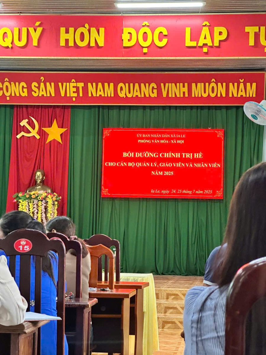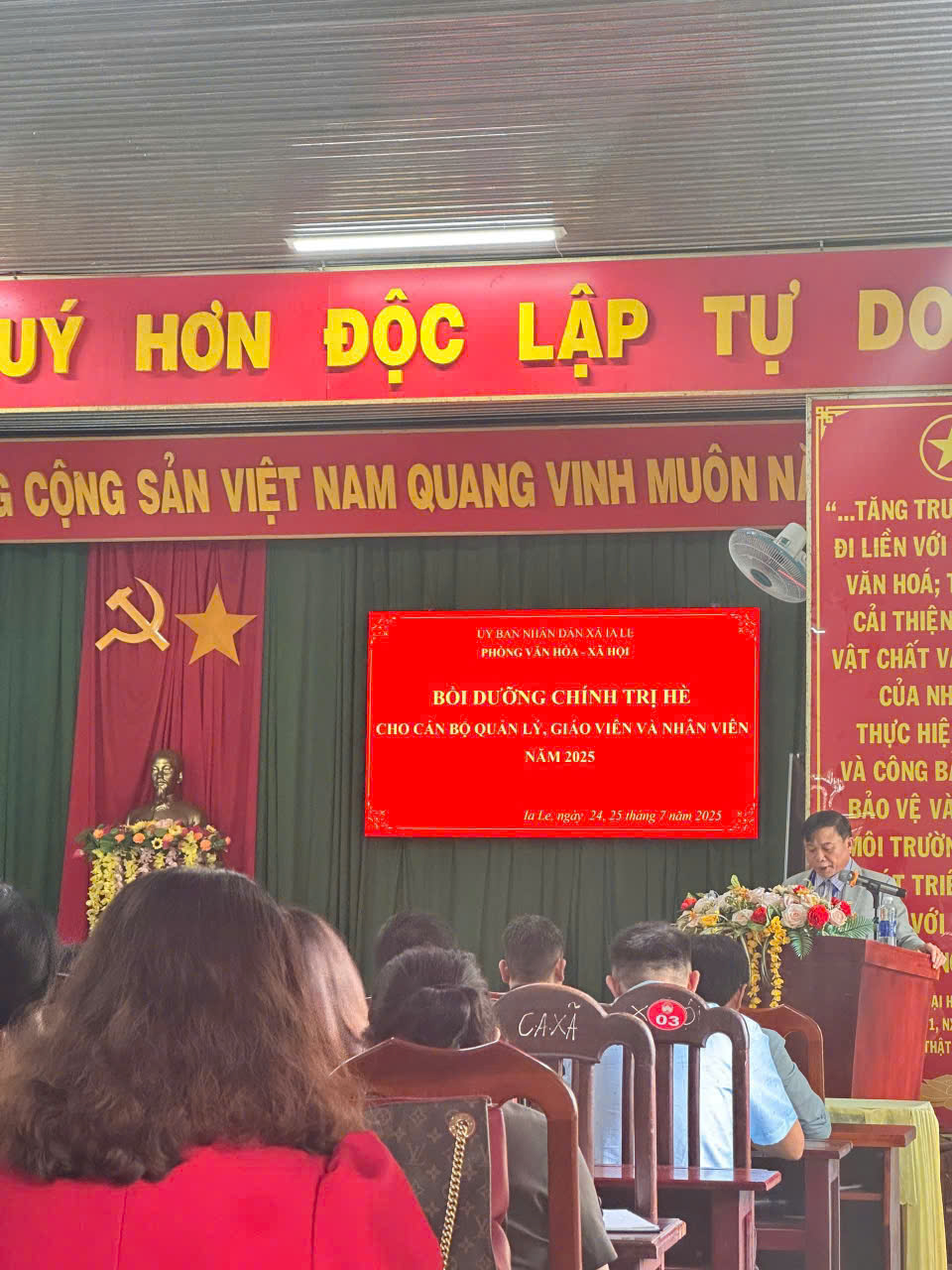 Thực hiện Kế hoạch của Ban Tuyên giáo Tỉnh ủy Gia Lai, trong 02 ngày 24 và 25 tháng 7 năm 2025, Đảng ủy xã Ia Le, tỉnh Gia Lai đã phối hợp tổ chức thành công 2 lớp bồi dưỡng chính trị hè năm 2025 cho 211 học viên gồm đội ngũ cán bộ, giáo viên, nhân viên đang công tác tại các cơ sở giáo dục trên địa bàn xã. Việc tổ chức được triển khai nghiêm túc, chu đáo, bảo đảm hiệu quả và chất lượng. Các nội dung chính được truyền đạt trong đợt bồi dưỡng gồm: